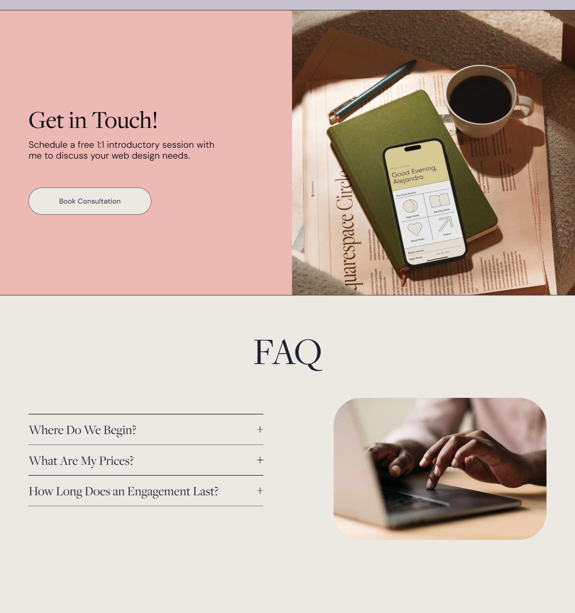 The accordion-style FAQ section answers common questions upfront (pricing structure, timeline, process), which saves you time and helps potential clients feel more confident about reaching out. (Plus, a strategic FAQ section can be great for SEO!)