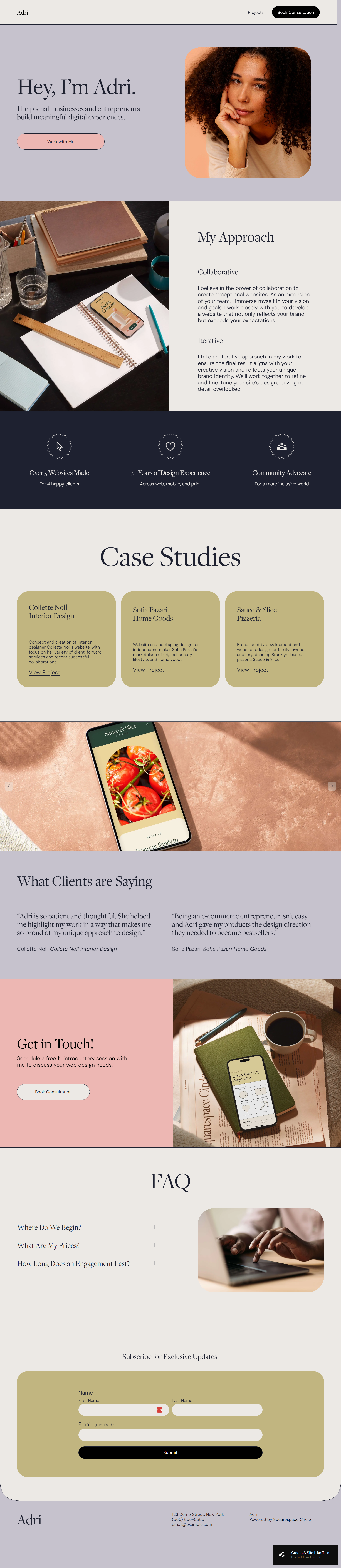 Personal intro section with your photo and statement, "My Approach" section where you explain your methodology and values, project preview grid with images and descriptions that link to detailed project pages, client testimonials, FAQ section with accordion-style answers, and CTA to schedule a consultation.