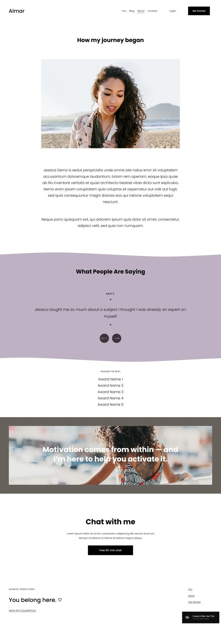 This template is designed for people who work directly with clients, especially in an online buisness. If you offer services like coaching, consulting, wellness, or personal development, and you want a calm, clear website that gets people to book time with you, Almar’s a smart place to start.