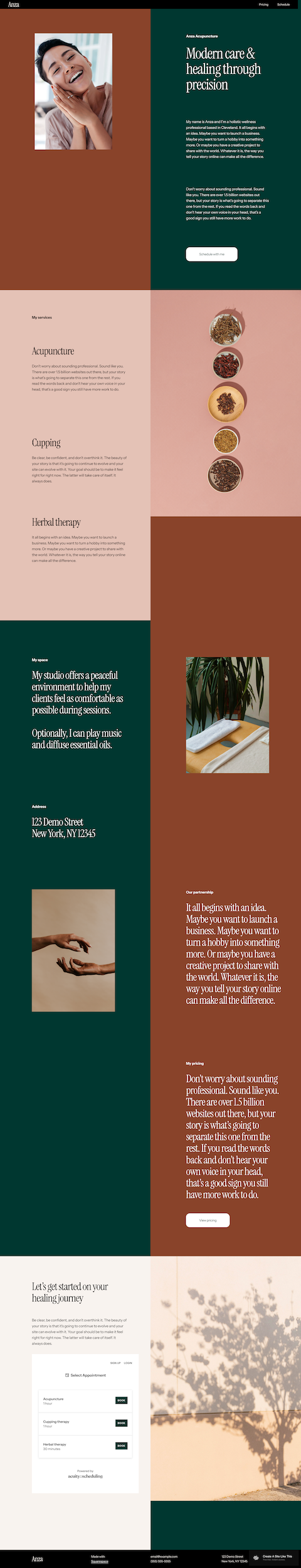 The demo literally shows an acupuncture practice, and it's perfect for that. The service breakdown sections let you explain different treatments (acupuncture, cupping, herbal therapy), and the earthy aesthetic matches traditional Chinese medicine's natural approach.