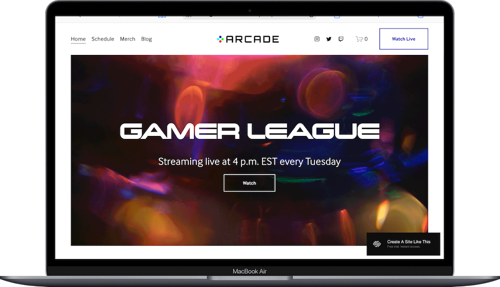 The demo shows an esports team (Team Arcade) with bold graphics, vibrant colors, team member profiles, streaming schedules, and merch sales. This one isn't like most Squarespace templates; it's designed for a specific niche with specific needs. The hero section features a dynamic "GAMER LEAGUE" headline with streaming info, the typography is bold and tech-forward, and there's a direct Twitch integration for live streaming. If you run an esports team, gaming clan, streaming organization, or gaming content brand, Arcade probably caught your eye for good reason.