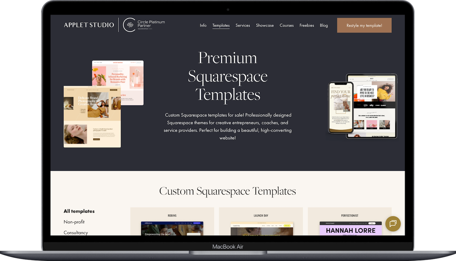 Applet Studio is run by Olga, a journalist-turned-Squarespace-designer who's been selling templates since 2020. She makes some of the most thoughtfully designed Squarespace templates I've come across. Templates are $225 -$297, and they're specifically built for coaches, consultants, course creators, and service-based businesses. Each template comes with a ton of pre-built pages and strategic layout options.