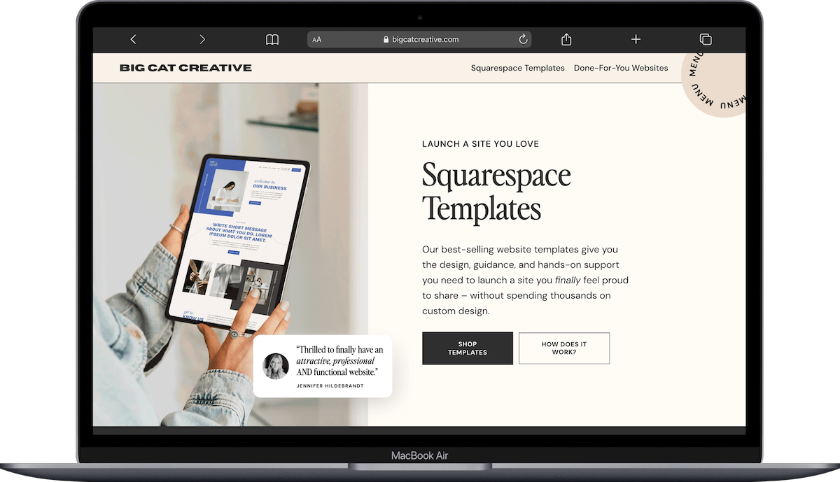 Big Cat Creative is founded by Erica, a New Zealand-based graphic designer who launched the shop in 2017. It's been a go-to in the Squarespace template world for years. All of their templates are $297 each (they currently have around 15 designs), and they cover service providers, photographers, copywriters, coaches, and creatives. Each template comes with step-by-step video tutorials and setup guides, which is a nice touch if you're doing it yourself.