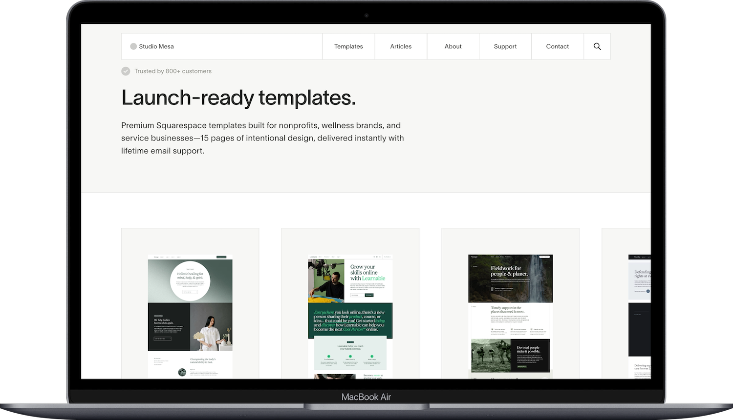 Studio Mesa creates premium Squarespace templates with a focus on strategy and user experience. Their templates range from around $95 for a one-page design up to $495 for their most comprehensive builds. The higher-end options come with 30 pages (which is a LOT of pre-built content to work with). They're known for templates that serve service businesses, consultants, and professional practices.