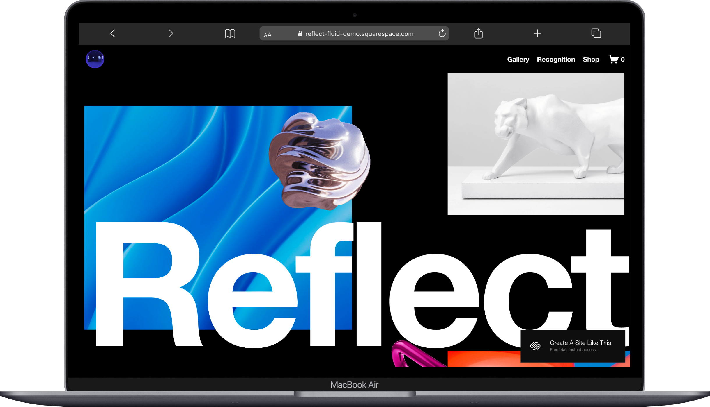 Reflect is Squarespace's most gallery-focused template. It was designed in collaboration with the art world (it's the Jeff Koons collaboration, if that means anything to you), and it's built to display large volumes of work with an immersive, full-screen experience.