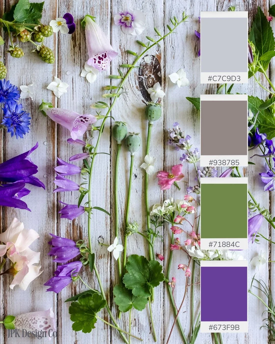 Soft lavender, muted mauve, sage green, and rich purple. Cottage-inspired without being cliché. Great for lifestyle brands, stationery designers, or creative coaches.