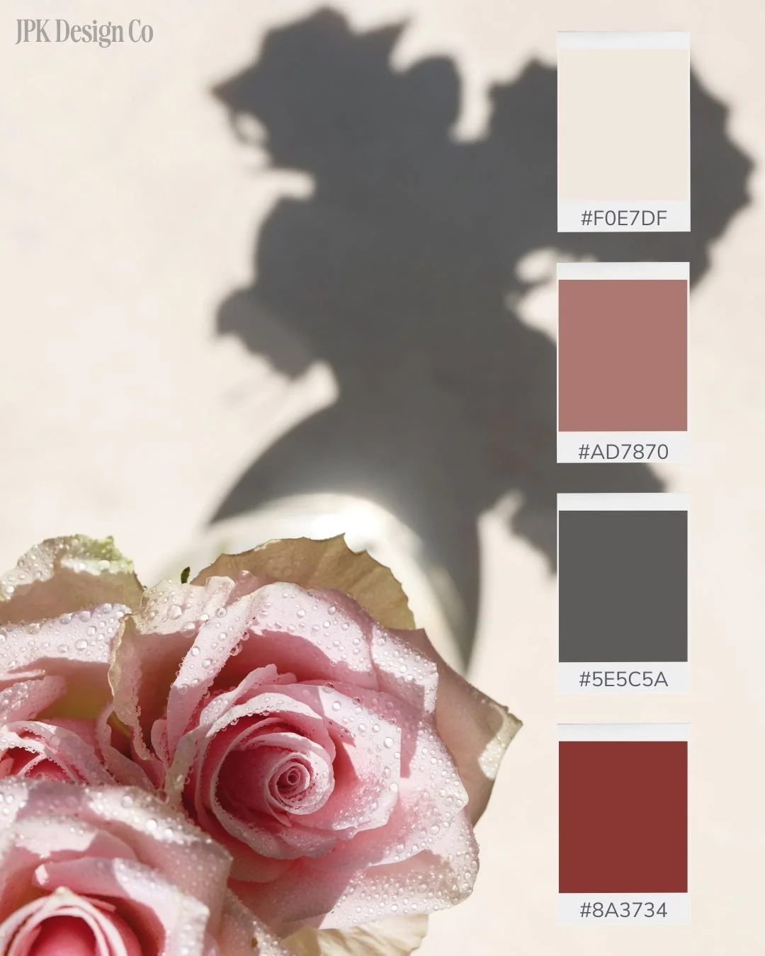 Soft blush, dusty rose, charcoal, and deep terracotta. This combination feels grounded and sophisticated. It's feminine without being overly sweet – good for brands that want warmth with some edge.
