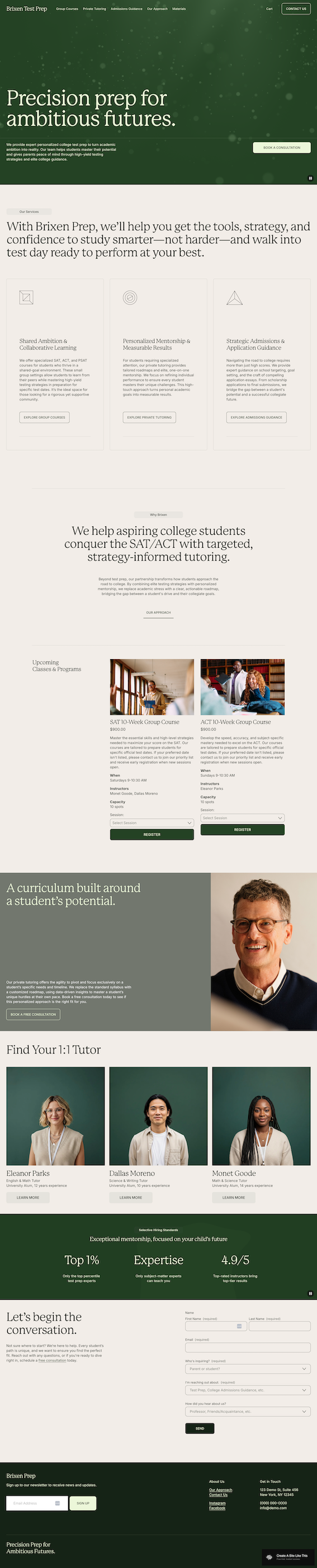 A third service page. In the demo this is admissions consulting, but it could be any specialty or premium-tier service that needs more explanation than the other two. It includes a credentials callout section and an FAQ accordion. Rename it to whatever fits your third offering.