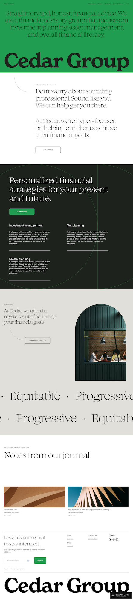 Cedar uses a simple, content-first approach that's perfect for explaining financial or complex services. The different background colors between sections guide your eye naturally from one area to the next. The generous white space keeps the text from feeling overwhelming. If you need room to explain what you do without relying on dozens of images, this layout is a good choice.