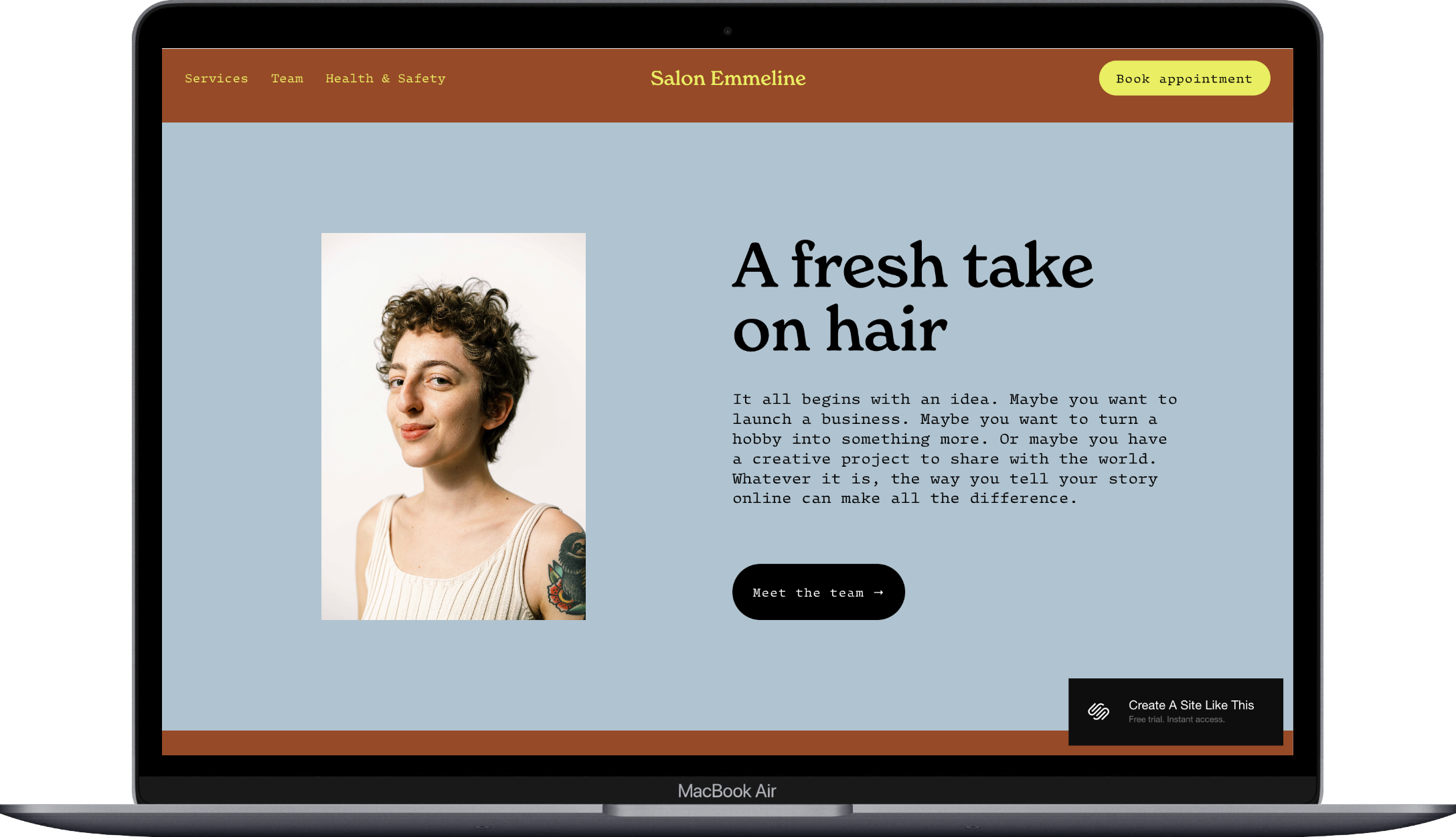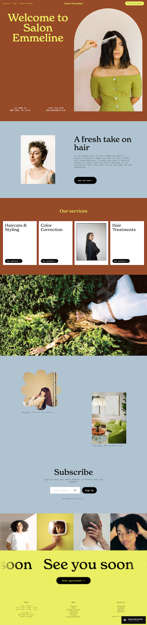 Looks like all the other Emmeline template-based websites. I mean, duh. But if you’re a salon owner and choose this template, you can be sure a lot of other salon owners have, too. So it won’t make your brand stand out as much as if you chose a different template or started from scratch.