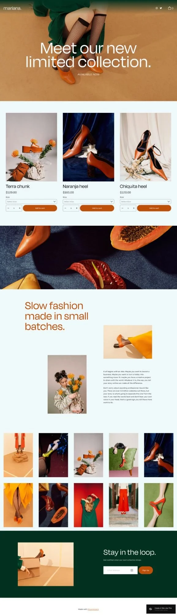 Mariana is perfect if you're a fashion brand or artisan business launching a limited collection (3-15 items) with bold, editorial photography and a strong visual identity.