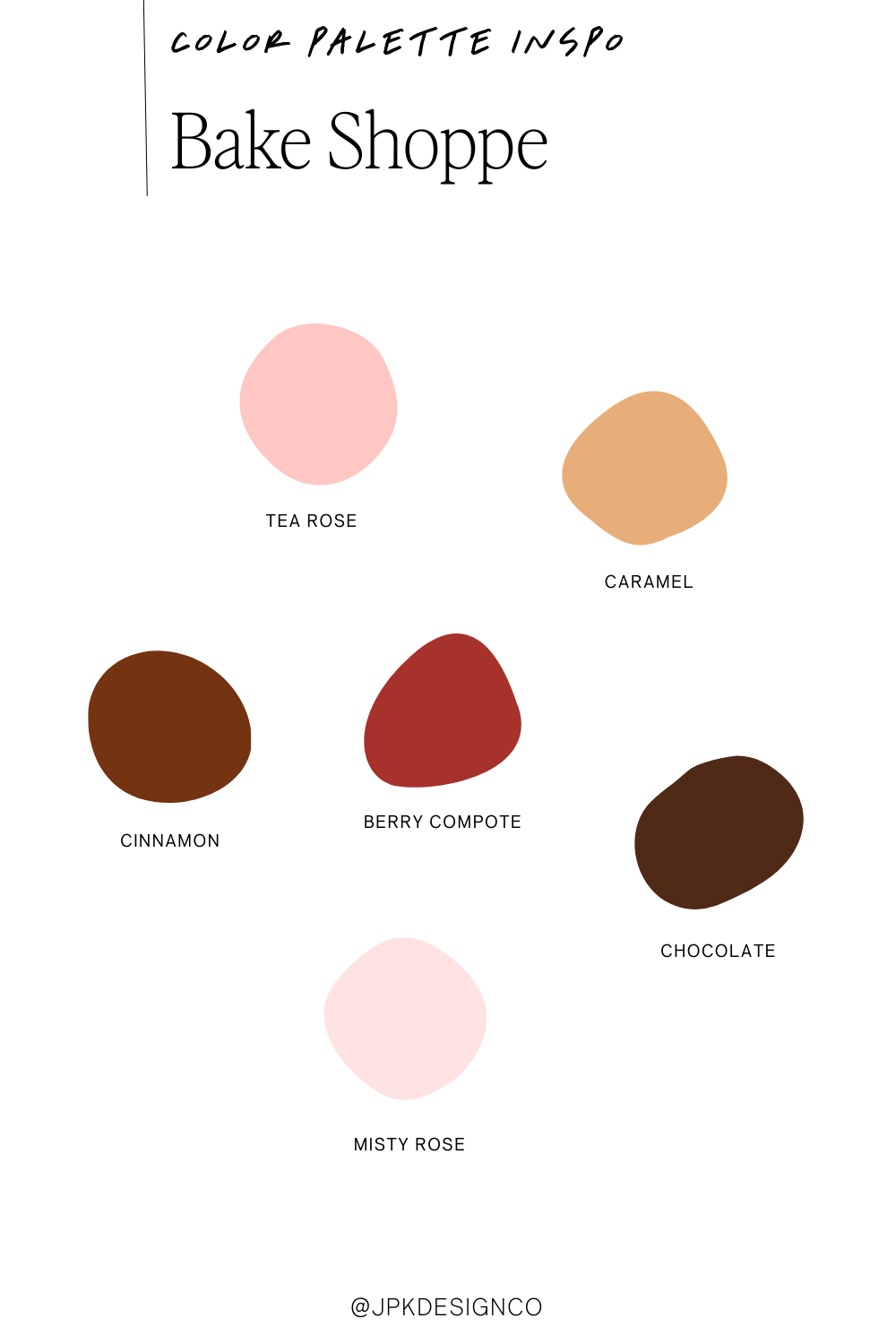 Soft tea rose pink pairs with warm caramel, rich cinnamon brown, berry compote red, deep chocolate, and gentle misty rose. It's like the visual equivalent of walking into your favorite neighborhood bakery. Think cinnamon roll, chocolate croissant, hot cocoa.