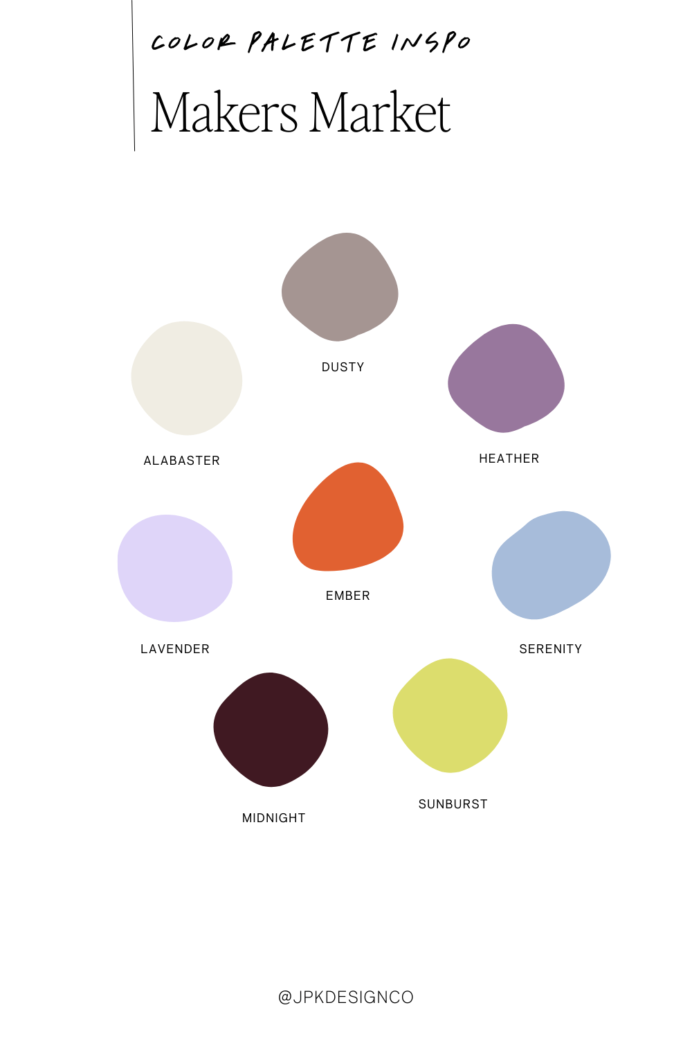 Soft alabaster whites blend with dusty taupe, vibrant heather purple, gentle lavender, rich ember orange, calming serenity blue, deep midnight, and cheerful sunburst yellow. This palette feels like browsing a curated craft fair.