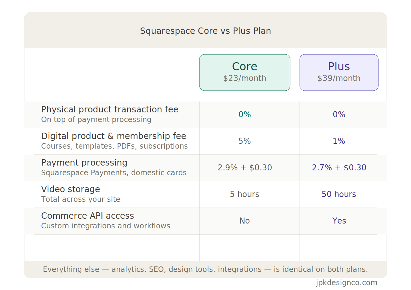 On commerce transaction fees, Core charges 0% on physical product sales, same as Plus. The real difference is digital products and memberships: Core charges 5%, Plus drops that to 1%.