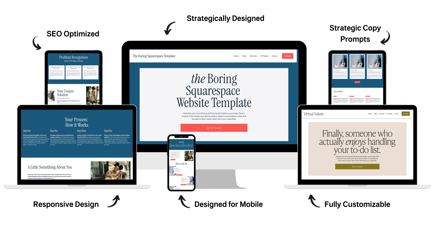 The strategic structure and copy prompts. Squarespace's built-in templates give you visuals, but don't include conversion strategy, SEO guidance, or help with content. The Boring Template includes frameworks based on conversion psychology and detailed prompts for what to write in each section.